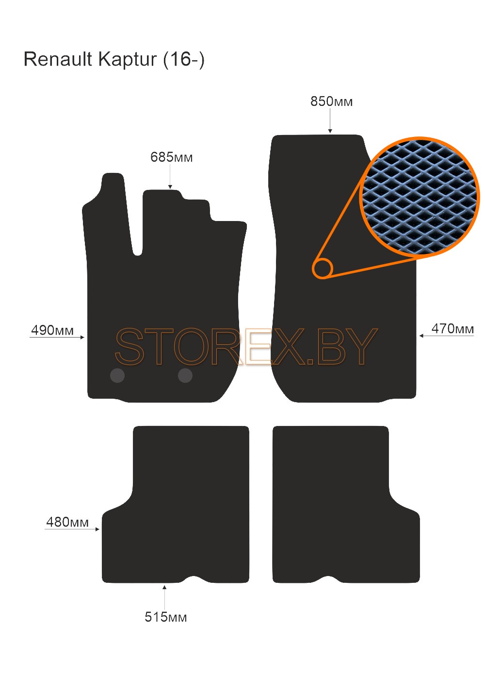 Цена указана за базовый комплект из 4-х ковриков в салон без подпятника и лейбла. Можно приобрести любой коврик отдельно (водительский или пассажирские), а также в багажник. Модельные коврики изготовлены по лекалам вашего автомобиля, плотно ложатся в салон или багажник. Основные преимущества ЭВА-полимера: Эластичность и деформационная стойкость.Широкий рабочий температурный диапазон от -70 до +80 градусов по Цельсию. Высокая устойчивость к механическому воздействию и агрессивным средам. Химическая инертность и нетаксичность, отсутствие запаха. Дополнительна возможна установка: подпятника из металла (уплотнение на водительском коврике размером 20*30 см); люверса и липучки для надежной фиксации; металлической лейблы с логотипом любой марки автомобиля. Возможные цвета: черный; серый; бежевый; коричневый. Два вида соты, ромб и шестиугольник.