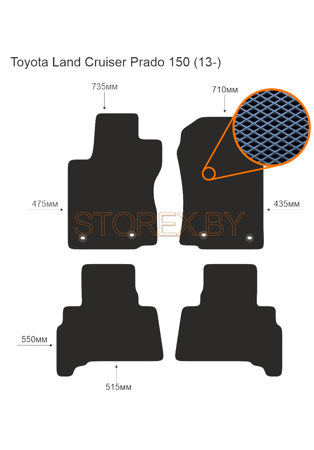 Цена указана за базовый комплект из 4-х ковриков в салон без подпятника и лейбла. Можно приобрести любой коврик отдельно (водительский или пассажирские), а также в багажник. Модельные коврики изготовлены по лекалам вашего автомобиля, плотно ложатся в салон или багажник. Основные преимущества ЭВА-полимера: Эластичность и деформационная стойкость.Широкий рабочий температурный диапазон от -70 до +80 градусов по Цельсию. Высокая устойчивость к механическому воздействию и агрессивным средам. Химическая инертность и нетаксичность, отсутствие запаха. Дополнительна возможна установка: подпятника из металла (уплотнение на водительском коврике размером 20*30 см); люверса и липучки для надежной фиксации; металлической лейблы с логотипом любой марки автомобиля. Возможные цвета: черный; серый; бежевый; коричневый. Два вида соты, ромб и шестиугольник.
