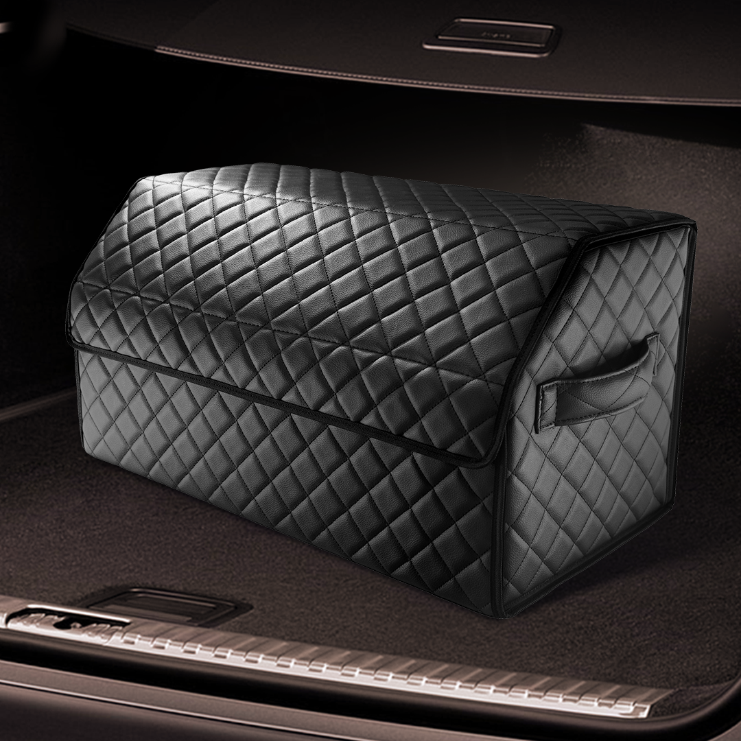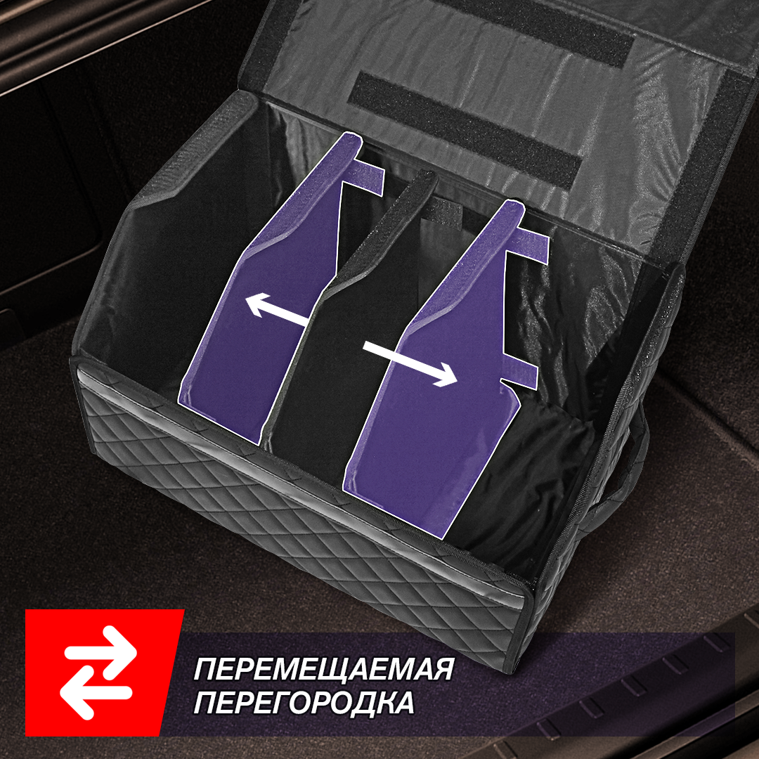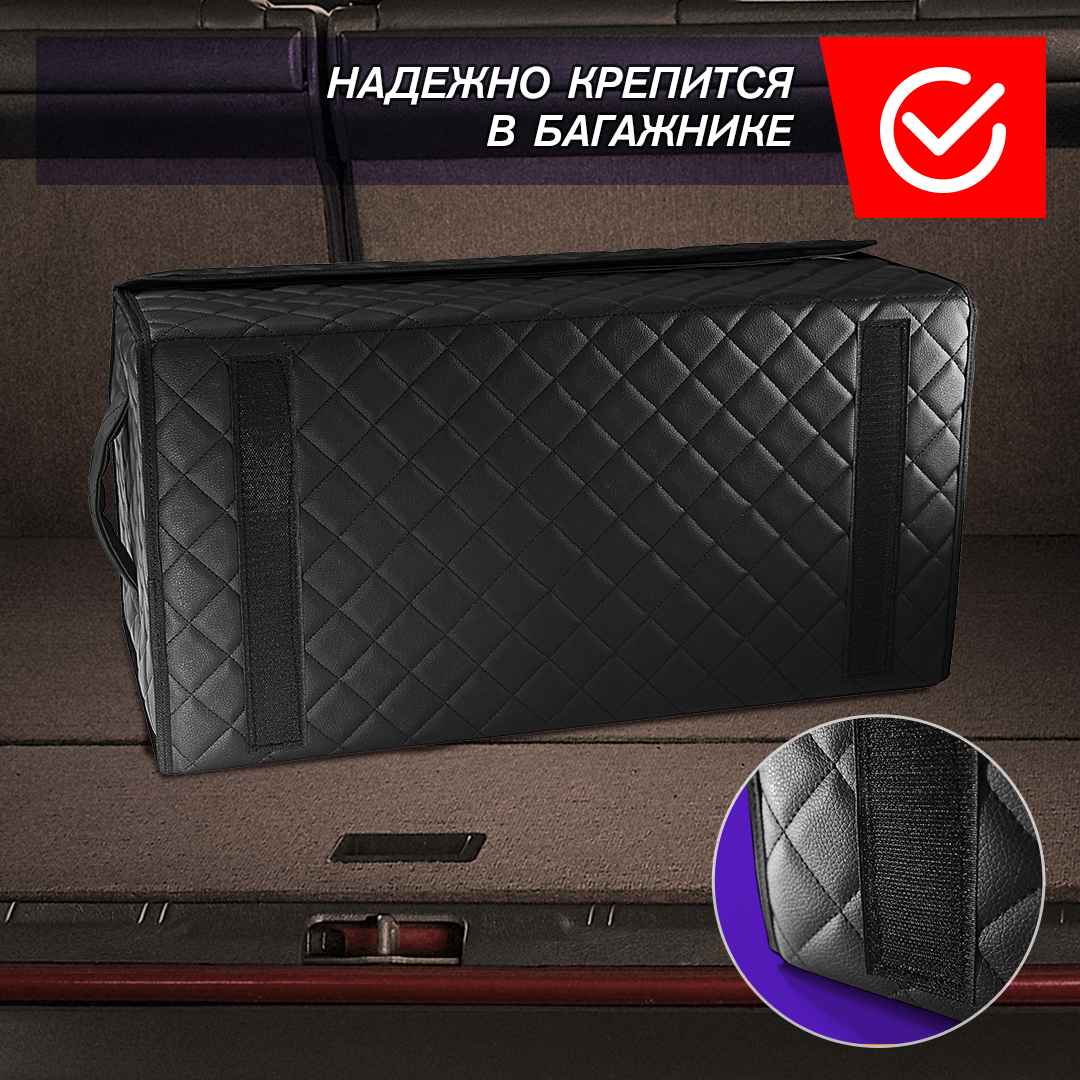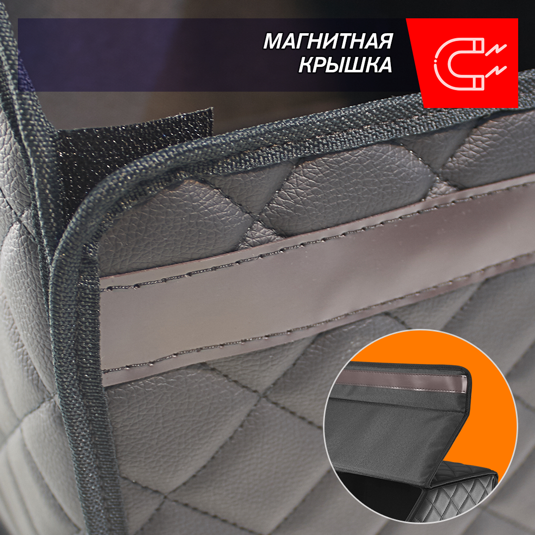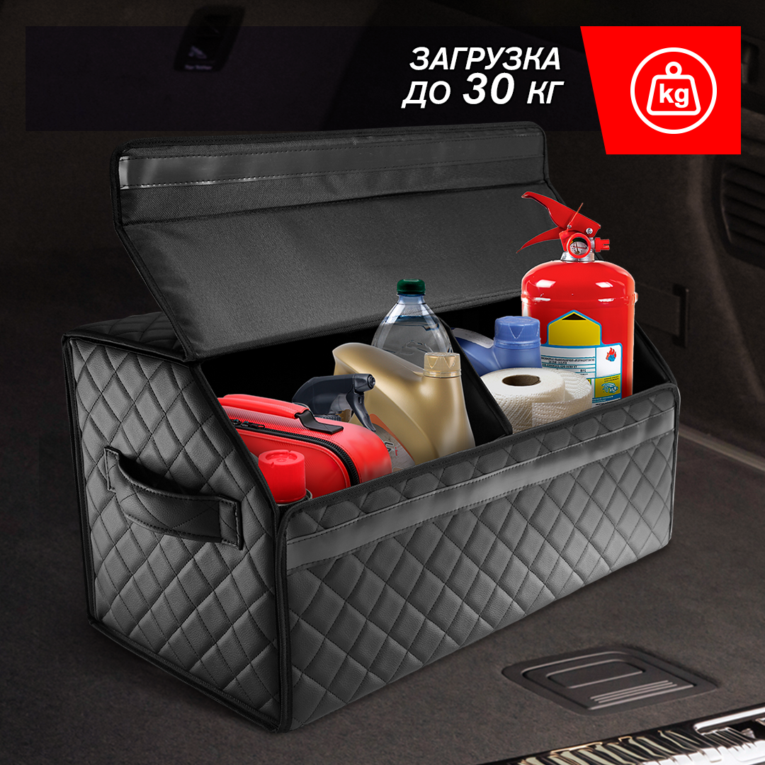 Автокейс в машину спасет ваш багажник от бесконечного беспорядка! Автомобильный универсальный органайзер для хранения всех необходимых аксессуаров и быстро находить их. Кофр изготовлен из износостойкой автомобильной экокожи. Крышка надежно фиксируется магнитной лентой. Имеет прочный корпус из ДВП. На дно нашита антискользящая лента для предотвращения перемещения кейса при поворотах и торможении. На боковых стенках расположены ручки из экокожи для удобного перемещения. Внутренняя отделка изготовлена из водонепроницаемой ткани, даже если внутри прольется масло, оно не испачкает багажник. Автокейс имеет разборную конструкцию для удобного и компактного складского хранения, ведь в разобранном виде автокейс в высоту всего несколько сантиметров. Органайзер в багажник выполняет одну из важнейших функций - поддержание чистоты и порядка в вашем автомобиле, позволяет оптимизировать пространство багажника и хранить все важные автомобильные вещи в одном месте. Данный аксессуар - отличный помощник для водителей с различными хобби: спорт, рыбалка, охота. В саквояже найдется место для мяча, снастей, насоса и др. Незаменим также в поездках на дачу, отдых или же супермаркет, в органайзер с легкостью влазят банки, сланцы и пакеты с продуктами. Автокейс от Elcrucce изготовлен из автомобильной эко кожи с повышенной прочностью, что не только придает эффектный внешний вид , но и очень практичен в использовании, обычная влажная салфетка справится с загрязнением на ней. Каркас выполнен из ДВП, поэтому выдерживает нагрузки до 30 кг., не заламывается, в отличии от картона и не размягчается при намокании. Крышка на магните - для легкого открытия органайзера одной рукой, прослужит долгие годы, что не скажешь о липучках. <br>