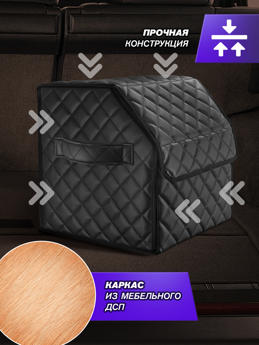 Автокейс в машину спасет ваш багажник от бесконечного беспорядка! Автомобильный универсальный органайзер для хранения всех необходимых аксессуаров и быстро находить их. Кофр изготовлен из износостойкой автомобильной экокожи. Крышка надежно фиксируется магнитной лентой. Имеет прочный корпус из ДВП. На дно нашита антискользящая лента для предотвращения перемещения кейса при поворотах и торможении. На боковых стенках расположены ручки из экокожи для удобного перемещения. Внутренняя отделка изготовлена из водонепроницаемой ткани, даже если внутри прольется масло, оно не испачкает багажник. Автокейс имеет разборную конструкцию для удобного и компактного складского хранения, ведь в разобранном виде автокейс в высоту всего несколько сантиметров. Органайзер в багажник выполняет одну из важнейших функций - поддержание чистоты и порядка в вашем автомобиле, позволяет оптимизировать пространство багажника и хранить все важные автомобильные вещи в одном месте. Данный аксессуар - отличный помощник для водителей с различными хобби: спорт, рыбалка, охота. В саквояже найдется место для мяча, снастей, насоса и др. Незаменим также в поездках на дачу, отдых или же супермаркет, в органайзер с легкостью влазят банки, сланцы и пакеты с продуктами. Автокейс от Elcrucce изготовлен из автомобильной эко кожи с повышенной прочностью, что не только придает эффектный внешний вид , но и очень практичен в использовании, обычная влажная салфетка справится с загрязнением на ней. Каркас выполнен из ДВП, поэтому выдерживает нагрузки до 30 кг., не заламывается, в отличии от картона и не размягчается при намокании. Крышка на магните - для легкого открытия органайзера одной рукой, прослужит долгие годы, что не скажешь о липучках. <br>
